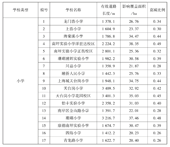 表5.17 各小学城市空间(道路)阻隔下衰减一览表
