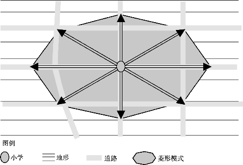 多菱形复合体产生机制研究:在多种阻隔要素的影响下,小学步行网络可达性的范围呈现不规则的多菱形复合体,必须认识到实际的步行网络可达性与常规规划之间的差别,并需研究更加合理的模式,以在不同的研究层面和实践层面适用不同的模式。