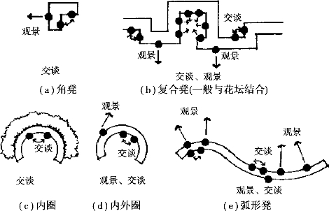 调查发现步行道宽度对人群交通性步行、购物性步行、休闲性步行都有显著影响,拓宽步行道宽度对促进人群步行出行至关重要。宽阔的步行道可以布置多样步行空间,同时可以提供人们活动、表演的空间增加步行空间步行趣味。不同人群由于不同的自身特点对步行环境的需求各不相同,因此,在步行系统中针对不同人群设置相应的步行空间。比如,老人的舒适行走距离是成年人的一半,只有150 m,超过这个距离,就应该设置途中休息处(图6.44),对老人而言,步行中有效的步行休息可以补充体力缓解疲劳,从而延长步行时间和步行距离。在休息交流空间中可以用适当的座椅设置来增加人群和其他行人的交流(图6.45至图6.46)。