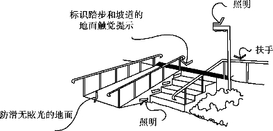 首先应该提供符合人群使用特征的步行道,在路面材料的选择上,尽量选用表面平整、透水性强又不易湿滑的材料。目前很多路面选用石材铺装,只注重图案、色彩好看,却忽视雨雪天气路面湿滑的问题,而且一些砂砾、砖块等表面凹凸不平的材料往往不利于老人使用拐杖等,混凝土材料的坚硬铺装又很容易引起人群不必要的摔伤等(表6.24)。对于老人而言,由于腿脚不便,步行道路应尽量避免路面高差,在有高差变化的地方需要设置平坦的台阶和坡道。因为不同身体状况的人有不同的偏好,所以建议在有高差变化的地方坡道和台阶最好能综合使用(图6.47)。台阶和坡道应结合景观设置,配以圆滑扶手栏杆,台阶宽度至少1.5 m,保证两位老人可搀扶通过,踏面需采用非光滑处理。护栏、扶手等能够被人触及的设施,应该防止出现尖锐、粗糙部分,防止刮伤或摔伤老人。另外,步行道上需布置免费饮水池、遮阳避雨棚以及小品装饰,使人们在不同气候条件下都能够享受步行及恢复体力,让他们能够放心、安全、舒适地步行。