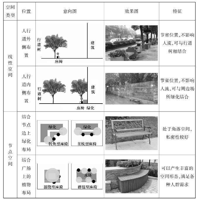 步行空间中设施的布局与人们步行的舒适性也有很大的关系。座椅设置的基本原则首先是不阻碍行人通过,即流动的人不会对人们的休憩行为造成影响。所以在人流量大的线性空间中,不宜布置大量的座椅,应该根据两侧功能选择座椅位置。座椅适合贴近建筑或者绿化布局,并结合乔木设置,且以连座座椅为主(表6.23)。在步行空间外侧时背对车行道,在步行空间内侧时面向车行道。在节点空间中可以布置较为丰富的座椅,形式和位置也可较为自由。