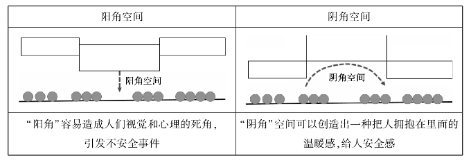 空间质量可以给人们以“安全感”的暗示,因此,维护和设计良好的步行空间节点和设施的质量十分必要。首先,注意对破败的建筑和设施进行定期维护;其次,在视线较好的地方可以设置一些高度和朝向适宜的座椅,预防盗窃等行为的发生;最后,步行空间“阳角”空间是向外侧突出的空间,这种通过社会自发监督空间让人产生了视觉和心理的死角,而“阴角”空间是把人们环抱着的空间,给人以安全感,步行空间节点设计中尽量减少“阳角”空间,增加“阴角”空间(表6.25)。