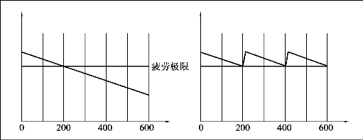 图6.44 不设休憩空间与间隔一定距离设置休憩空间情况下人的疲劳曲线之比较