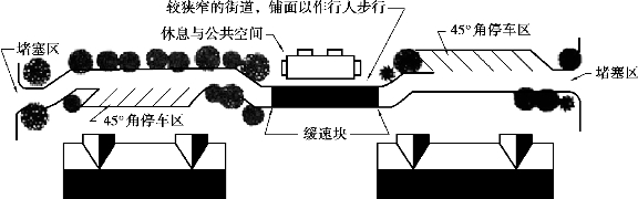 荷兰采用一种称为“Woonerf”的慢速交通理念,通过设计步行空间的方法使车速降低,增进安全、环境和生活质量。趋向于减慢车速的设计要素包括绿化岛、坡度变化、步行空间宽度变化、道路弯曲等。Woonerf步行空间的布局创造了具有特色的步行空间景观,促进了孩子、老年人及其他成年人之间的交往,因而受到热烈欢迎,许多欧洲城市传统布局的步行空间都开始转变。本文建议采用Woonerf的基本做法来限制机动车速度,创造适合老年人步行出行的安全舒适的住区步行空间环境(图6.48)。