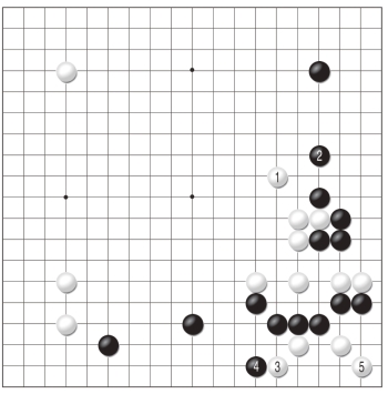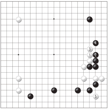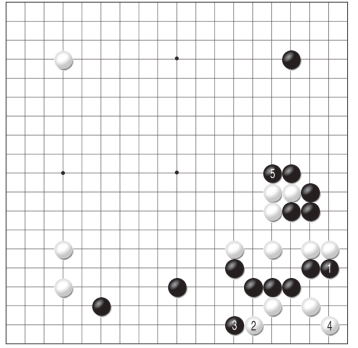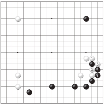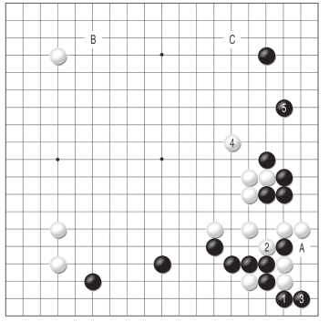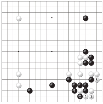白棋暂时不去活角,而是先走1位飞是良好的感觉,这也是AI的选择。黑2总要应一手,白3、白5再去活角,从容不迫。