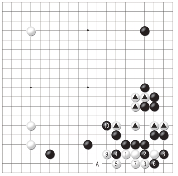白1爬并不便宜,黑2冲,再4位虎是行棋次序,白5扳时,黑6、黑8断吃一子,优于在9位退,至黑10扳,白数子薄弱,需要马上处理,将来黑棋还可以走A位搜刮白棋。本图是黑棋不错的局面。