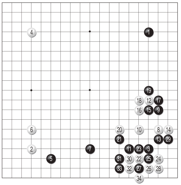 1933年吴清源因在棋战中获得优胜,获得受先与秀哉名人对弈一局的资格,布局中吴清源将黑棋前三三手棋,按三三、星、天元的顺序下出来,此举顿时引起轩然大波。这三手棋皆与日本传统布局格格不入,尤其是起手“三三”的下法,在本因坊一门中被定为“禁手”。本局白26点三三,是可下的一手。