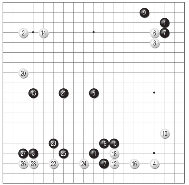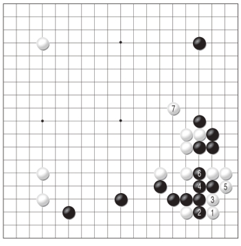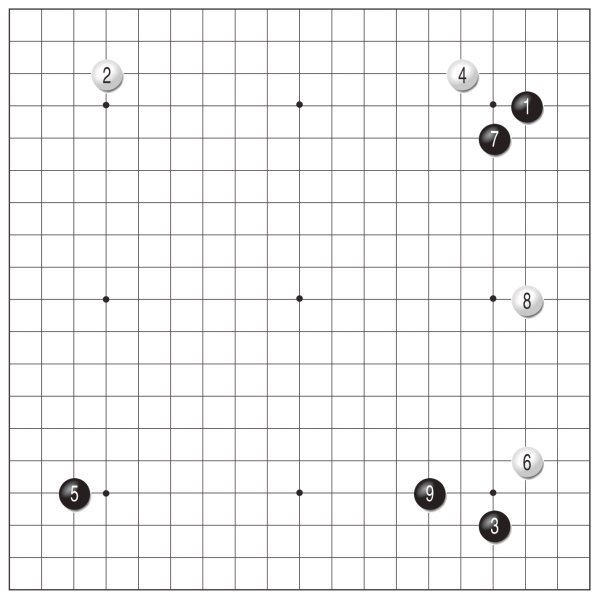 小结:日本古棋几乎都是小目开局,直到吴清源与木谷实发起“新布局”之后,占星位的下法才多了起来,之后围绕星位的攻防产生了点三三的手段。本篇中基本图三、图七是两分定型。