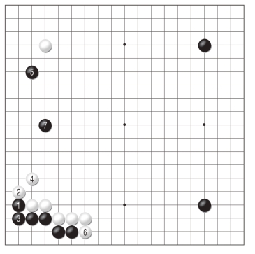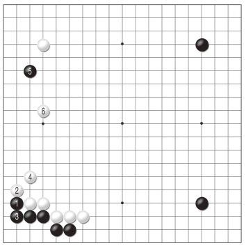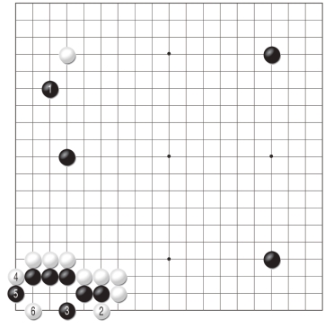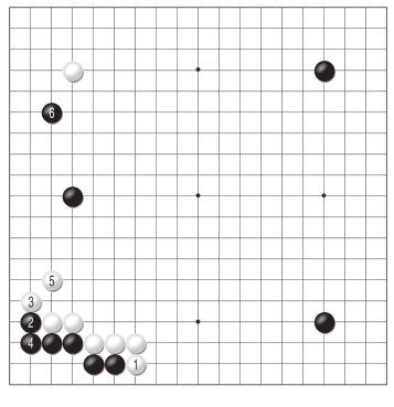 白1拐下,黑棋需要担心吗?答案是否定的,黑棋只需要2位先手扳粘,之后6位挂角就可以满意。