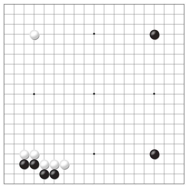 黑1爬是紧要的一手,虽然一般来讲爬二路是亏损的下法,但局面不同就要灵活掌握,不可死记硬背。白2总要长一手,黑3挡下活角,白棋如果再二路拐则变成了后手,本图黑棋远优于图七。