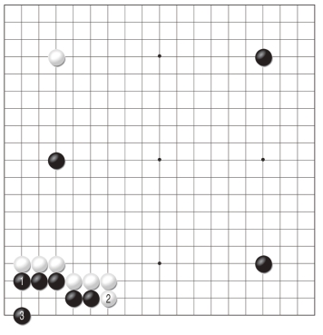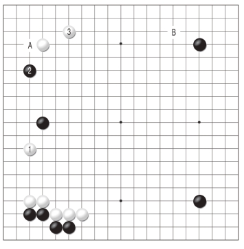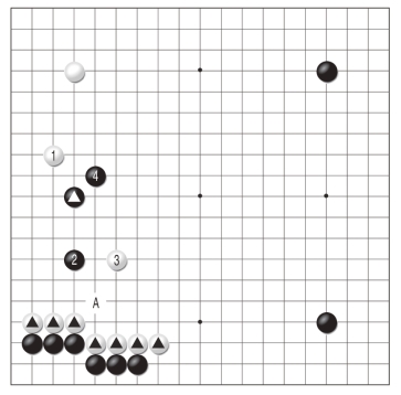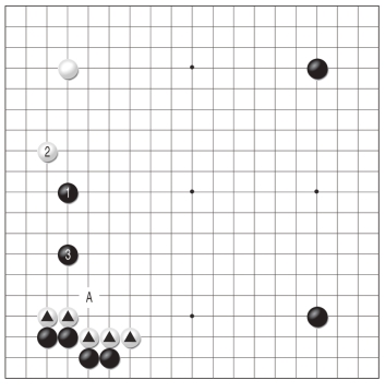 接上图,白棋会走1位逼住,黑2拆边是大致下法,白3镇头加强自身并对黑棋两子施压,黑4出头,将来黑棋还是有从A位点过来威胁白数子的手段。