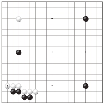 小结:面对对方星位直接点三三的下法是AI的首创,图十是两分定型,最后教大家一句口诀:点三三,不扳粘,要把厚势当孤棋。