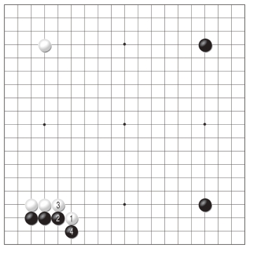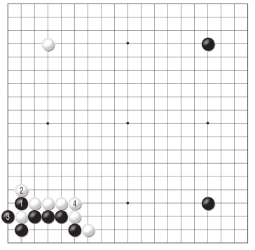 黑1断打反击,白2提是最强应手,黑3也不能退让,硬着头皮也要打上来,白4直接开劫无理,“初棋无劫”的棋诀可不能忘记。