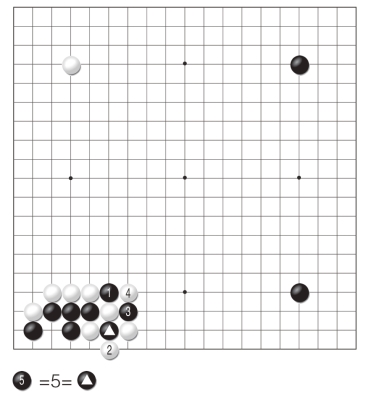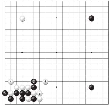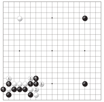 黑1断打一下,看似是俗手,却是此时的关键。白2接,黑3、黑5再吃白棋一子,这样就破坏了白棋外势的完整。注意,白棋6位征子不成立,黑棋可以7位跑出。