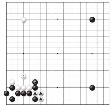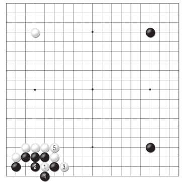 由于不能征子,白棋大致会1位跳,黑2长出,白棋被分割成两块棋,白三子与左边五子都要处理,白棋有些手忙脚乱。