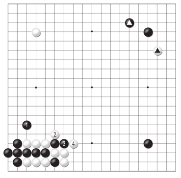 黑1跑出是直线思维,看起来很凶猛,白棋只能2位跑出,之后白棋连续三路爬,至黑9双方都是必然下法,接着白10先手打吃一下,再12位飞出,这时候黑棋才发现,自己外部所得有限,而角上几子面临被杀的境地,看来直线进攻并不是好下法。
