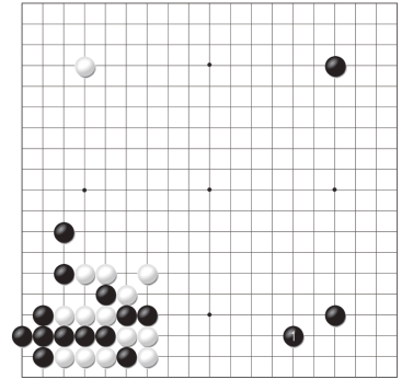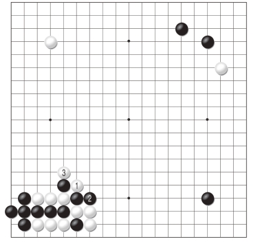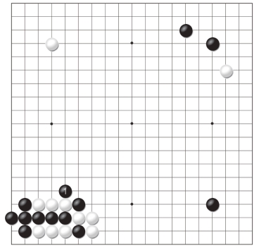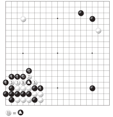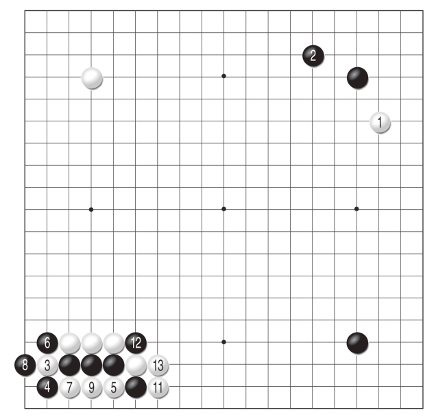 小结:左下角的攻防要注意征子的关系,当征子对黑棋不利时,黑棋可以采取图二的下法,图七、图十三两分。
