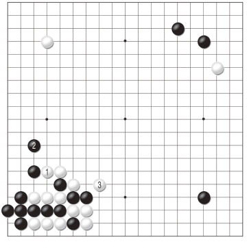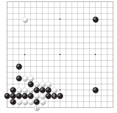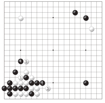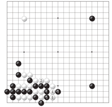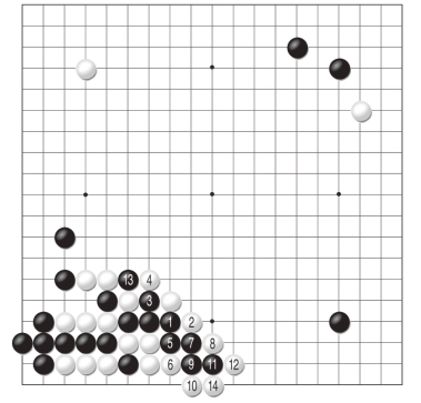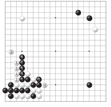 白1弯出,棋形不佳,黑2顶是严厉的下法,白棋顿时感到呼吸困难。为了逃出,白棋只有选择5位打、7位抱吃,黑8以下连续叫吃,将白棋打成一团,至黑12扳,白棋十分局促,白棋明显不利。