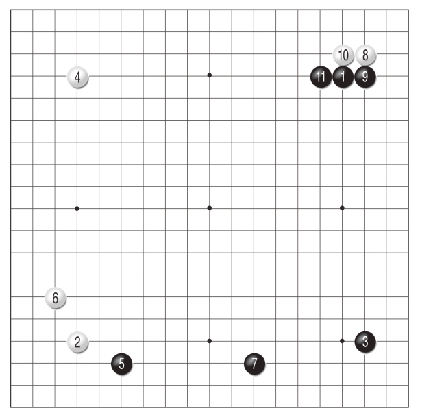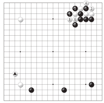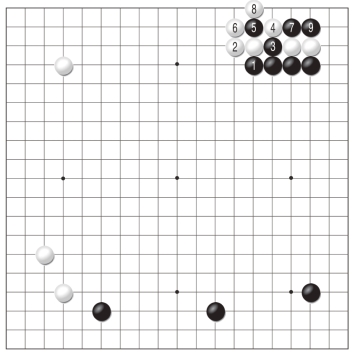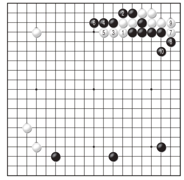 白1跳出也是可以选择的下法,黑2冲,之后4位断显得有些急躁,按照断哪边吃哪边的原则,白5是正确的下法,黑6、黑8吃角,白9贴,黑棋开局选择的是快速展开,现在却又去捞角地,这个下法有违黑棋的初衷。