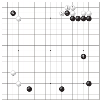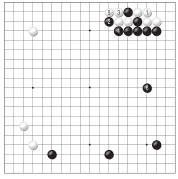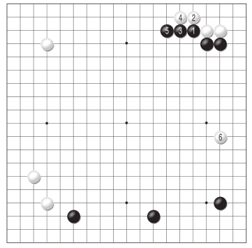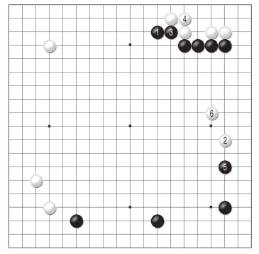 这样看来,白棋只能1位接,黑2顶手筋!黑2如果走4位压则妙味全无。白3只有吃回,黑4挡住,接下来白5拐,防止黑棋先手打吃。经过几个回合的较量,黑棋将白棋先手压缩在低位,再回到6位拆边,从战略上讲黑棋达到了目的。