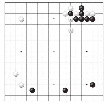 白1先打吃一下有必要,等黑2接住以后白棋再3位补,这样黑4拆边,白棋就可以5位飞,白棋稍优于前图。