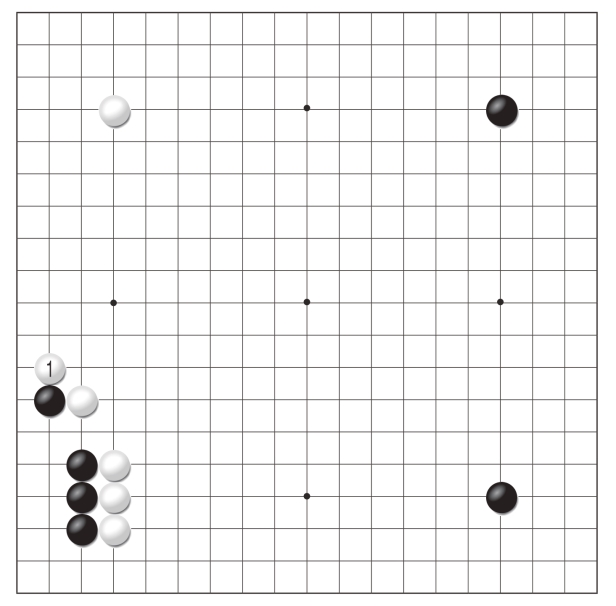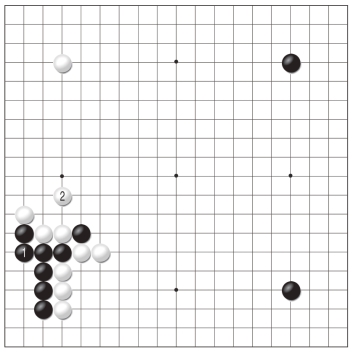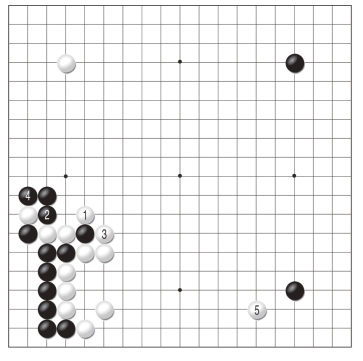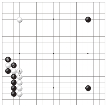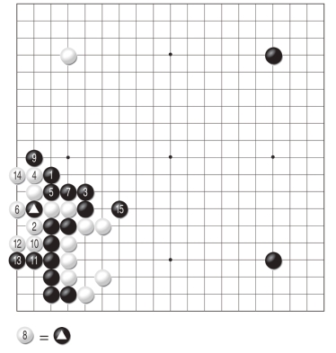 黑1点,强力反击。白2打吃是问题手,黑3长,白棋立刻陷入被整体包围的危险。白4以下奋力做眼,至白14,刚好两眼做活。黑15跳“入腹争正面”,整体来看,白棋蜷缩在边上,是黑棋还不错的局面。