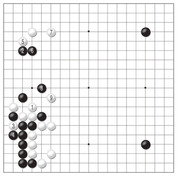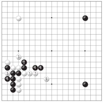 白1愚型弯出,一般情况不是好棋,但在这个局面还真是可以考虑。黑2挂角,白3先手打吃一下,再白5、白7定型,至白9是两分的局面。