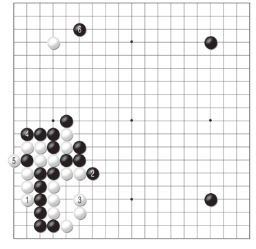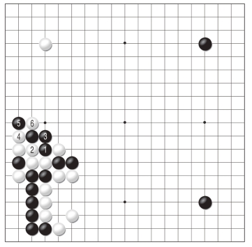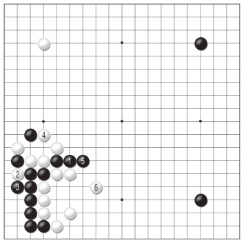 黑1、黑3反击,来势汹汹,白4拐必然,黑5强行挡住无理,被白6断,白棋形崩溃。