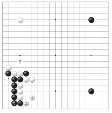 把拳头缩回来,先护住自己的要害,等对方露出破绽再进行攻击,打拳的方式同样适用于下棋。黑1、黑3扳粘先把角部稳固,白4虎补一手,这样黑棋角部已经做活,没有必要再走A位与白B位交换。接下来黑棋就要重拳出击了!