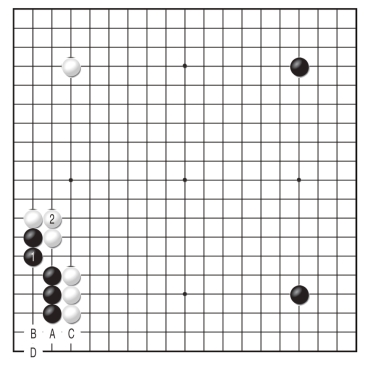 黑1退显得有点软弱,白2接住厚实,将来白棋可以按照白A、黑B、白C、黑D的次序先手便宜。