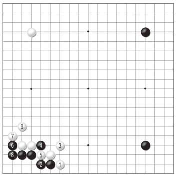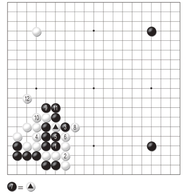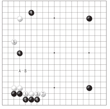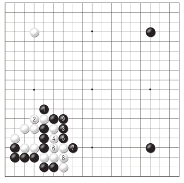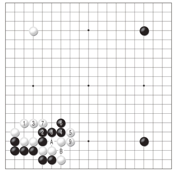 白1顶则还原成为AI点三三下法的基本定式,以下至黑8,这一变化我们在“简明篇”中已经做过讲解,此处不再赘述。黑棋始终把先手权抓在手里,这也是其用意所在。