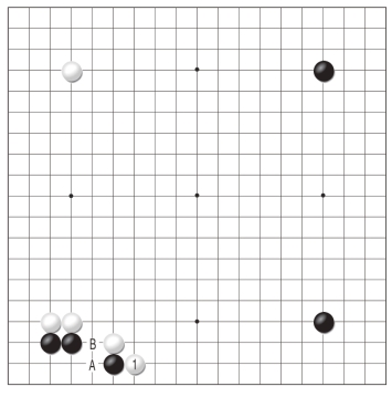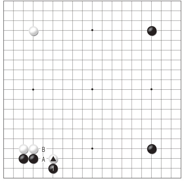 当白棋位飞时,黑棋不做A和B的交换,而是选择1位单托一手,就是这看似平常的一手棋,却引发了其后无数的难解变化,我们马上来了解一下黑棋的用意。