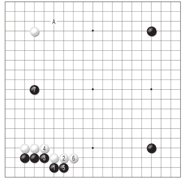 白2退也在黑棋的预料之中,黑3、黑5都是先手,之后黑7分投或者A位挂,与上图大同小异。