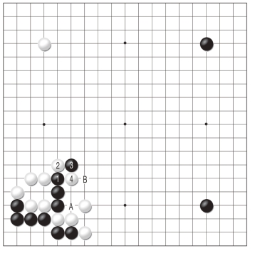 你有你的想法,我有我的算盘。白1扳住就是对黑棋二路托的反击,这也是复杂变化的开端,之后黑棋有两种应对的方法。A位退是相对简明的下法,B位则会引发激战,我们先看简明的下法。