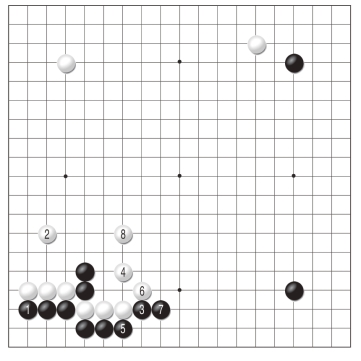 黑1挡住是白棋所期望的一手,白2拆二,黑3再顶已经错过时机,至白8,白棋成功的化解了黑棋的攻势。