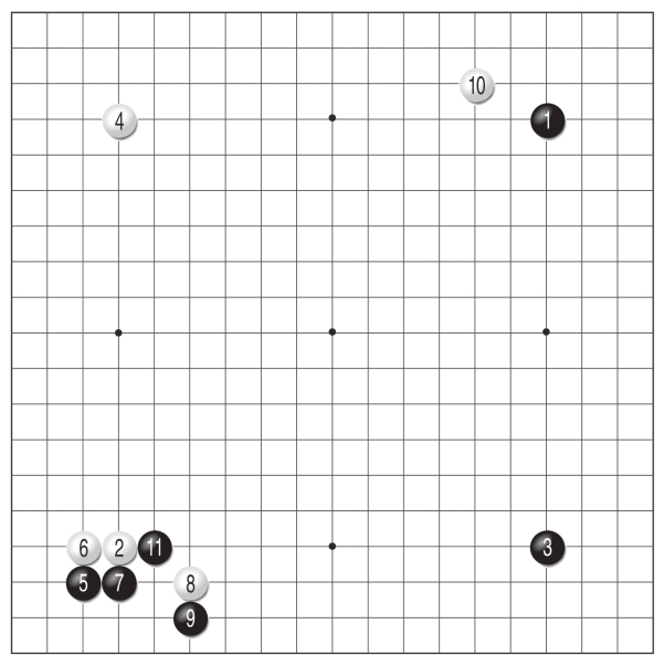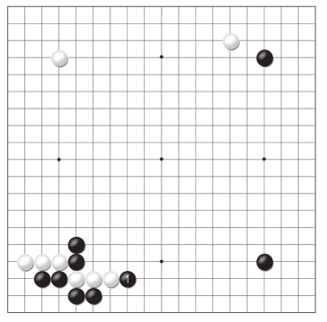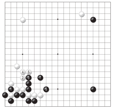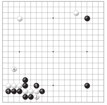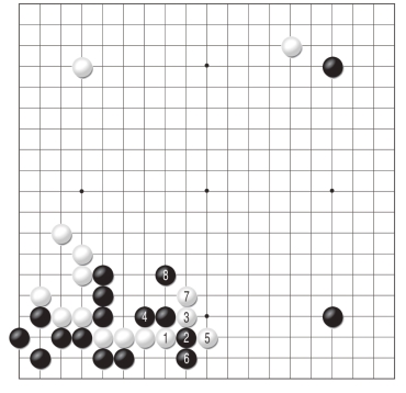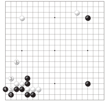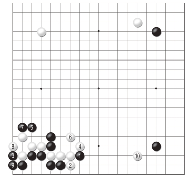 白1、白3扳虎,是AI的招牌下法,已经多次见到。黑4是关系到双方眼形的要点,绝对不能放过,白5飞出,形成作战的局面。
