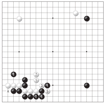 白1如果还是跳出,情况就大不一样了。黑2爬过,当白3虎时,黑4连扳紧凑,由于黑棋自身已经安全,不需要再去A位挡做活,黑棋可以放心走8位抢攻白棋,白棋陷入苦战。