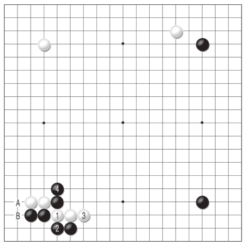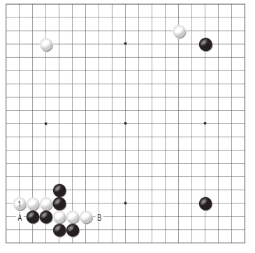 白1立下是本手,接下来黑棋会在A、B两点之中考虑,到底走哪个更好,我们接着往下看。