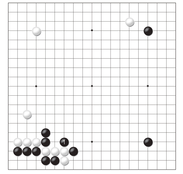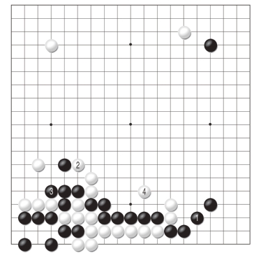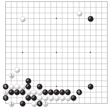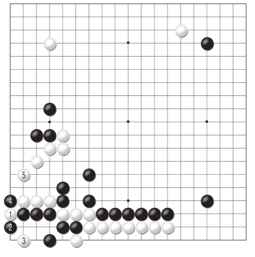 角上的死活情况十分重要,如果是活棋当然是黑棋优势,可是白1扳再白3点,一击致命!此时定眼一看,角部形成著名的“大猪嘴”(棋形酷似猪嘴,因而得名)黑棋被净杀。