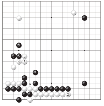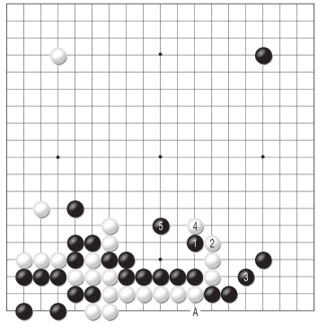 黑1跳是经过深思熟虑的一手,白2贴,有了黑1与白2的交换,黑棋中央数子的安全性大幅度提高,黑棋再3位尖补棋就没问题了,白4扳时,黑5跳出扬长而去。黑棋一旦活出,A位扳杀棋的手段立刻凸显,白棋将陷入困境。