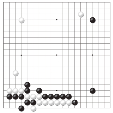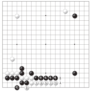 白1以下连续二路爬是“华山一条道”,为了保住性命,白顾不了太多了。一般来说开局爬二路绝不是好棋,但这个局面有些特殊,一旦白棋安全做活,黑棋角部就会出现死活的问题。至白11,黑棋A、B两点如何抉择?