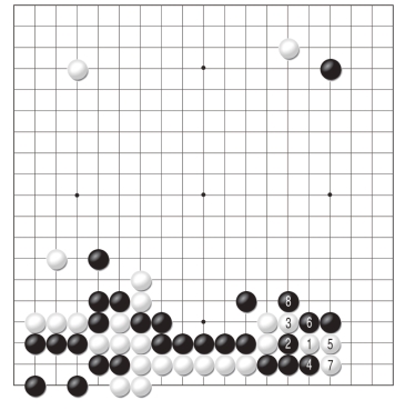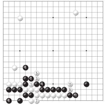 因此,白1以下冲断是唯一的选择,黑6跳时,白7粘一下是为自己留下活棋的后路,之后白9断,双方四、五块棋犬牙交错,激战一触即发!