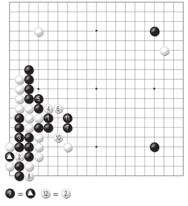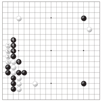 接上图,白1先爬,再白3、白5断开黑三子,黑6跳出时,白7先做活,再9位发动攻击,黑棋不好应对,是白棋优势的局面。