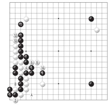 黑1是稳健的下法,白2打吃,感觉舒畅。黑3接住是为了避免打劫,白4以下先分断黑棋,之后白10、白12先做活,再白14顶攻击黑棋,将来白A与黑B的交换是白棋的先手权利。本图变化与上图区别不大,也是白棋不错的局面。