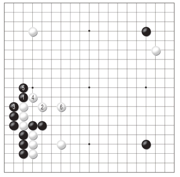 黑1顶是激烈的一手,白2跳,避开正面激战,黑3爬过,白4虎一下,再6位跳,黑棋两子可弃可取,不用急着逃出,本图对于双方都是可以接受的定型。