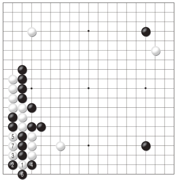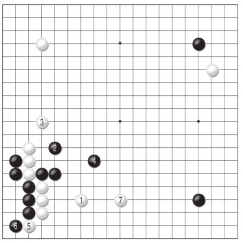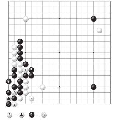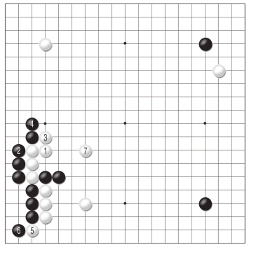 此时白1扳是AI推荐的手段,黑2挡住,白3断试应手是高级战术,目的是根据黑棋的应对再来选择相应的下法。本图中黑4太过冲动,白5、白7断打,黑棋瞬间崩溃。