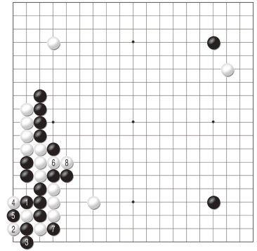 黑棋1位打吃,白2一路打好手,白棋如走黑3位,被黑棋2位立,白棋会顿感索然无味。本图黑3立下有些过分,白4后形成打劫,白6找劫时黑7如消劫,白8冲出转换,白棋形势有利。