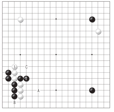 白1长出是唯一的选择,黑2长必然,激战在所难免,之后白棋有A、B、C三种选择,到底走哪个好呢?