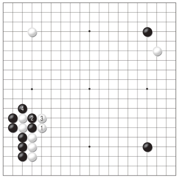 白1、白3连续打吃两下是万万不可的下法,黑4吃白棋两子后,心情极为愉快。像这种棋形,是一定要避免的,宁肯多死几个子,也不能被对方临空“拔花”。