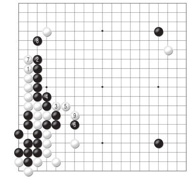 白1拐是最凶狠的下法,黑2是必然下法,至黑8,这个定型大家还有印象吗?不错,在“顶鼻变化”中曾经讲解过一个极为相似的棋形,结论是拐下的一方危险。但是与本图棋形有所区别,有时候失之毫厘谬以千里,那么最终结果会是怎样呢?